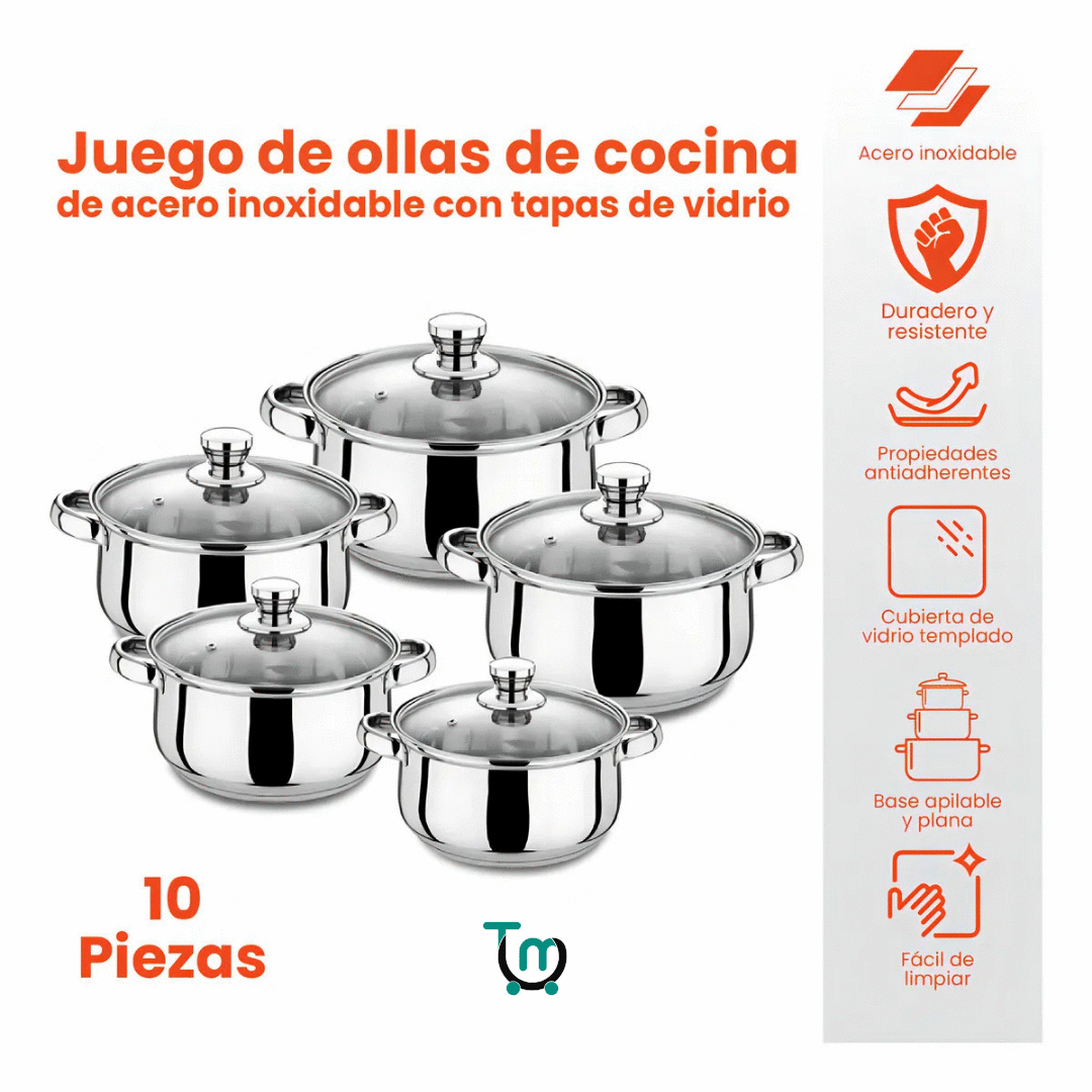 Juego de Ollas Batería de Cocina 10 Piezas Acero Inoxidable Tapas de Vidrio