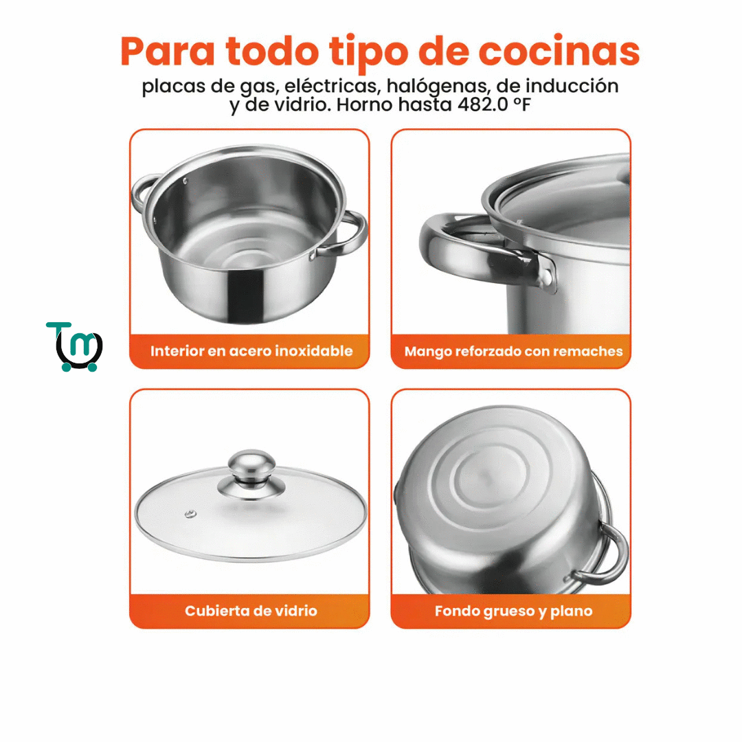 Este juego de ollas no es un gasto, es la única inversión a largo plazo que harás en tu cocina. Fabricado en acero inoxidable de alta calidad, resiste la corrosión, el óxido y las manchas, manteniendo su brillo por años... (continúa con el resto del copy de la sección).