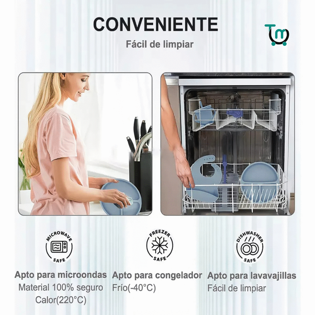La silicona de alta densidad es naturalmente resistente a las manchas de alimentos (zanahoria, remolacha, tomate). Olvídate de restregar. Simplemente enjuaga el set bajo el grifo o déjalo en el lavavajillas. El tiempo que antes dedicabas a limpiar el piso y la silla lo puedes dedicar a jugar y conectar con tu bebé.